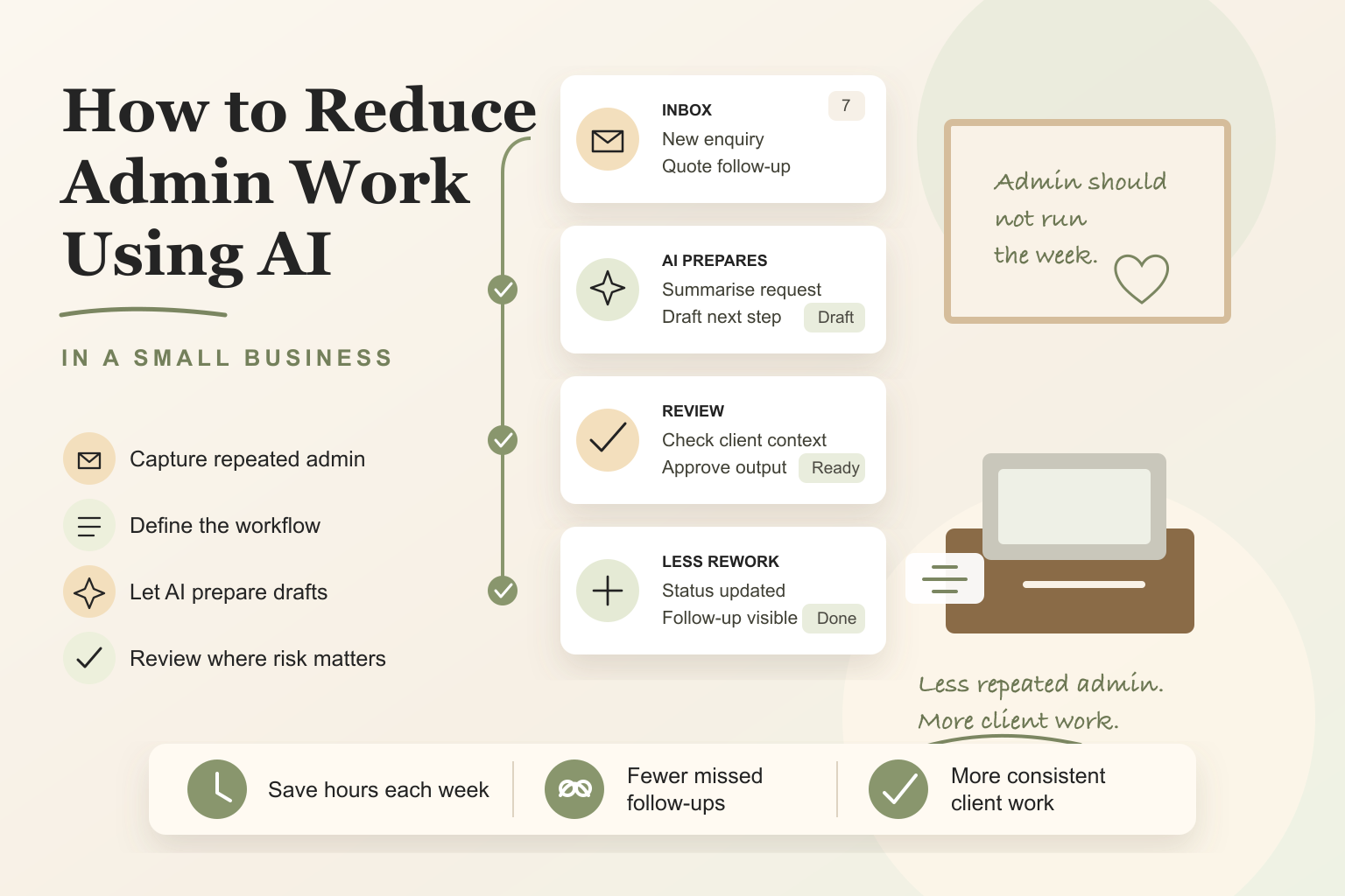 To reduce admin work in a small business, start by removing repeated low-value tasks from daily operations, not by buying more AI tools. Identify the admin that happens every week, define the trigger and owner, then use AI to draft, summarise, classify, or prepare work while people keep review where risk matters.